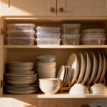 Empieza por vaciar el armario y agrupar por categorías: platos y vasos juntos, tuppers en otro montón, y piezas grandes aparte. Coloca inmediatamente a la vista los objetos de uso diario en la franja media; encima, deja elementos de uso esporádico como moldes o copas de celebraciones; en la franja superior, guarda cosas estacionales o repuestos. Para apilar sin que todo se convierta en una torre inestable, usa cajas apilables y bandejas planas: las cajas contienen y las bandejas convierten el fondo en un nivel extra que puedes deslizar. Las piezas que se apilan naturalmente, como tazas y platos, ganan estabilidad si alternas separadores blandos o paños finos entre ellas.