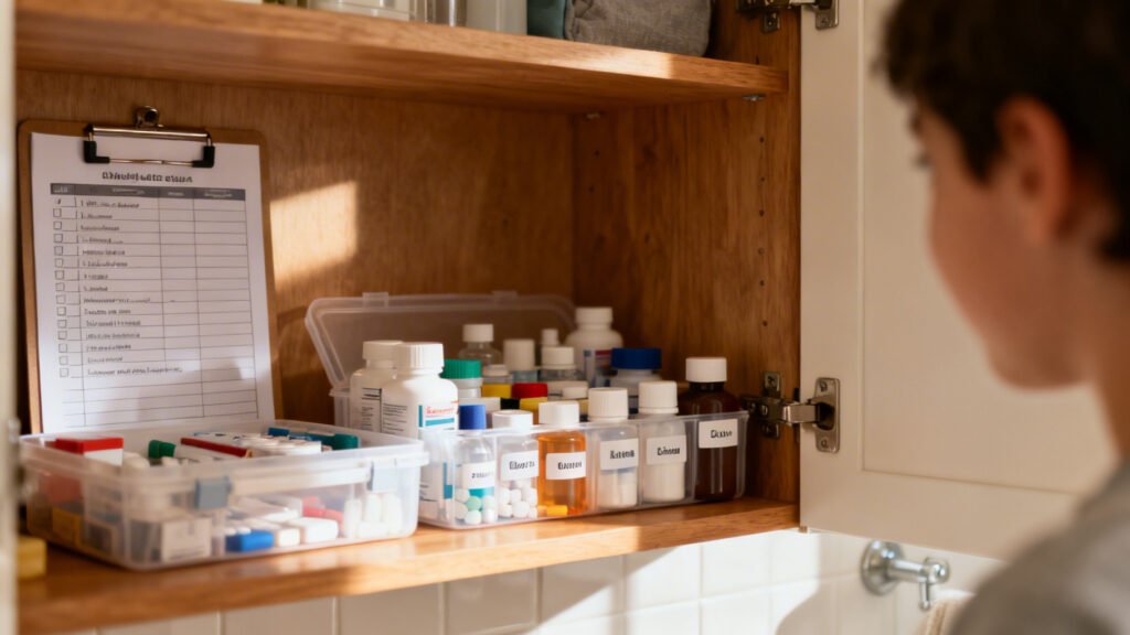 La checklist está pensada para adaptarse: funciona bien en el botiquín del baño, en un armario de primeros auxilios del hogar o en una caja de viaje. Ajusta las secciones según el espacio y los productos que tengas fuera del baño.