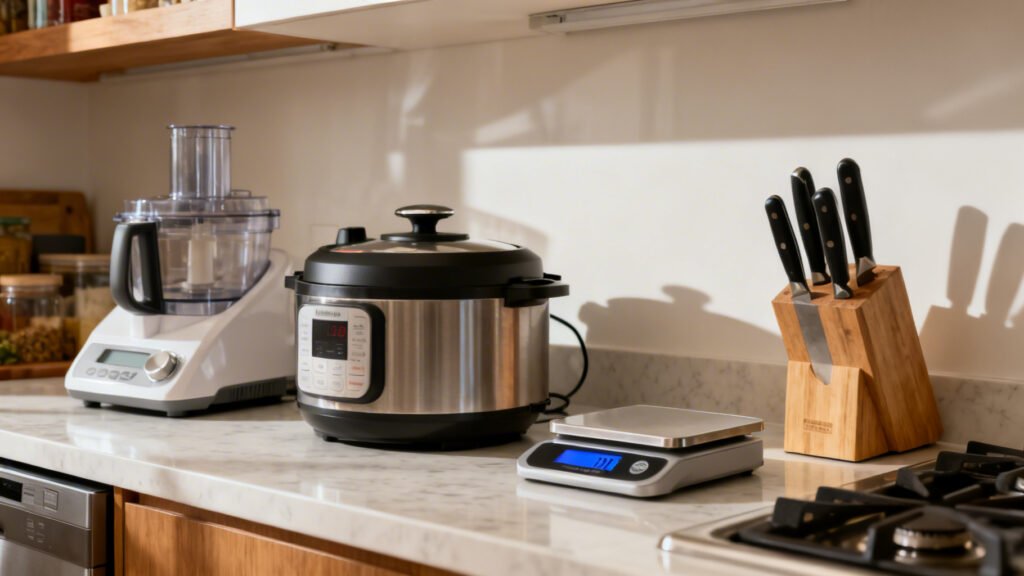 No todos los aparatos te ahorran tiempo. Prioriza aquellos que sustituyen tareas largas o que multiplican tu capacidad sin añadir complejidad. Un procesador de alimentos te libera de picar, rallar y mezclar en segundos; una olla a presión reduce cocciones largas a una fracción del tiempo; una báscula digital evita dudas y compras innecesarias; y unos buenos cuchillos mejor afilados hacen que cortar sea rápido y seguro. Si eliges modelos compactos y con funciones claras —tazón de tamaño razonable en el procesador, válvula sencilla en la olla, tara y precisión en la báscula— obtendrás el máximo beneficio sin pagar por funciones que no vas a usar.