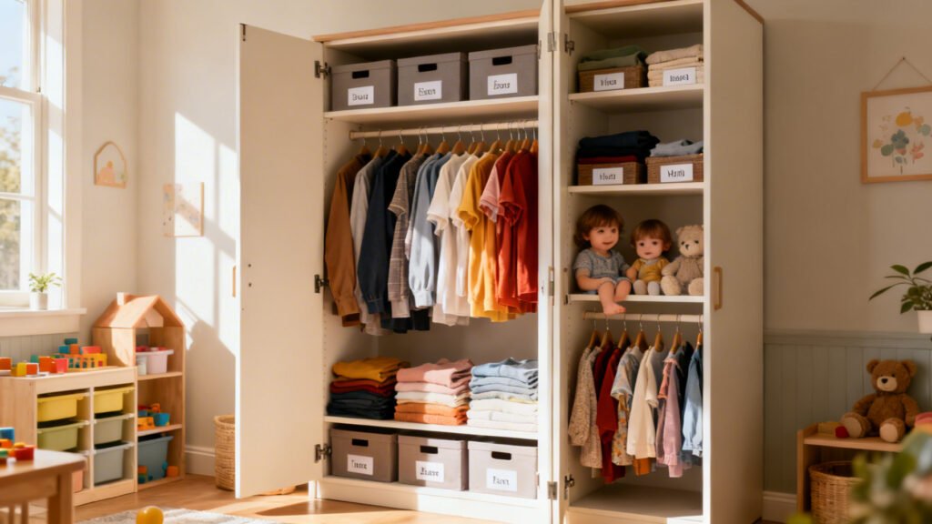 Cajas transparentes y baldas a distintas alturas ayudan a combinar ropa infantil y adulta sin confusión.