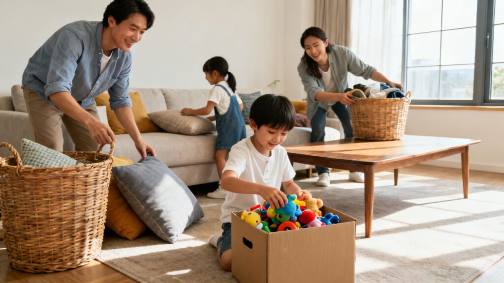 La clave está en la consistencia y en una estructura que todos comprendan en 30 segundos. Empieza estableciendo un momento fijo: justo después de la merienda, antes de cenar o al terminar la tarde. Primero reúne a la familia y decide un objetivo concreto para esos diez minutos: devolver cojines a su sitio, recoger juguetes del suelo, vaciar una bandeja con papeles o colocar mantas en la cesta. Después, asigna responsabilidades breves y visibles para cada persona. Un adulto puede encargarse de ordenar superficies y vaciar papeleras, otro de recoger objetos pequeños y los niños de llevar sus juguetes a la caja designada.